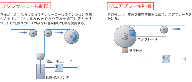 ・テンションコントロールを行うには摺動抵抗の低いシリンダと高精度な圧力制御が必要です。低摩擦タイプのシリンダと精密減圧弁や電空レギュレータの組合せでご使用ください。