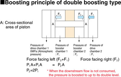 The booster regulator (valve) is a product to increase the pressure upstream of the valve to double (or four times) supply pressure. It produces high pressure to downstream. The booster regulator (valve) have two chambers for boosting and two chambers to actuate.