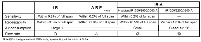 Please refer to the table below for the specifications and features of the IR, IR-A, & ARP precision regulators including the IR-A regulator series(IR1200-A/IR2200-A/IR3200-A). ARP is a direct operated precision regulator that adjusts pressure with a single diaphragm and regulating spring. IR and IR-A are pilot type regulators that regulate pressure with 2 or 3 diaphragms and a regulating spring. IR-A can also be used between a cylinder and a solenoid valve, while an ARP requires selection of the backflow function to be used in a similar application.