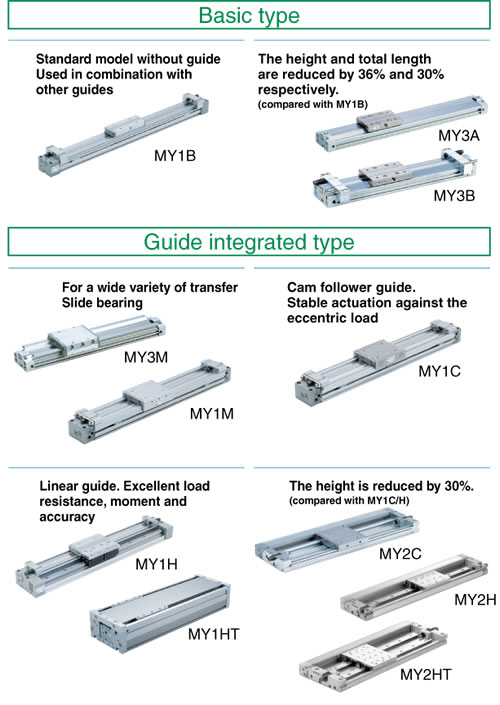 We have the MY1∗, MY2∗ and MY3∗ series. Please refer to the following "MY variations" about their features. We are also releasing a refreshed type "-Z" series. Please select the appropriate model suitable for the load being driven based on "Guide Cylinder Selection Software" available on the SMC website.