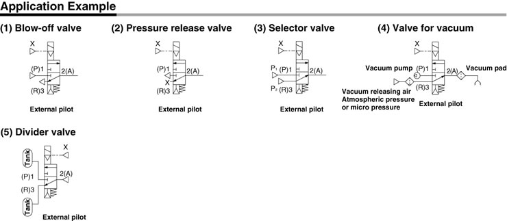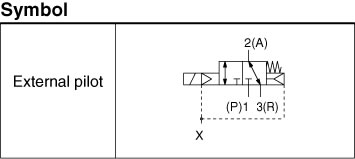 The external pilot type is a valve where pressure is supplied to an individual external port (X port) to switch the main valve. Accordingly, the external pilot type is suitable for supplying vacuum pressure or lower air pressure (0.2 MPa or less) or for using A port as the atmospheric releasing port, e.g. Blow-off valve type.