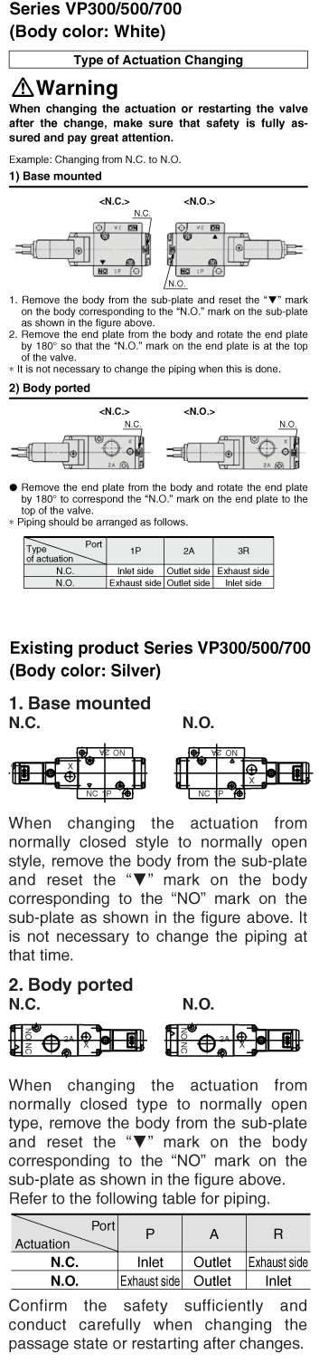 For the body ported type, remove the end plate from the body and rotate the end plate by 180° and replace the plate on the body. For the base mounted type, remove the body from the sub-plate and position the "▼" mark of the body to the "N.O." mark of the sub-plate. (rotating the valve body 180°) In the refresh product of the base ported type (White colored body), 180°rotation is required not only to the valve body, but also to the end-plate for changing the valve types.