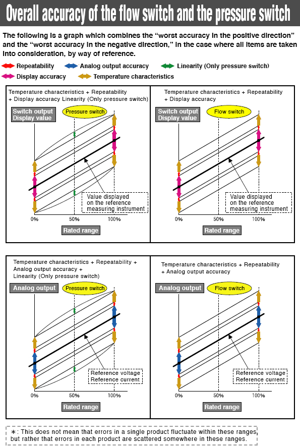 The accuracy is indicated in the specifications column of the PFMB7 series. The value consisting of a display accuracy of ±3% F.S. added to the temperature characteristics of ±5% F.S. and repeatability of ±1% F.S. becomes the worst value of the switch output display value accuracy. The value consisting of an analog output accuracy of ±3% F.S. added to the temperature characteristics of ±5% F.S. and repeatability of ±1% F.S. becomes the worst value of the analog output accuracy. Although there are variations from one product to another, the accuracy of each product is within the range of the total accuracy.