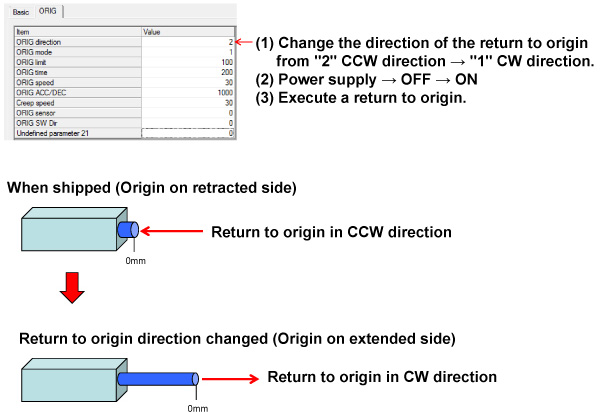 If the direction of return to origin is changed, the motion range will also change. Therefore review the 'Stroke (+)' and 'Stroke (-) values in the basic parameters.
