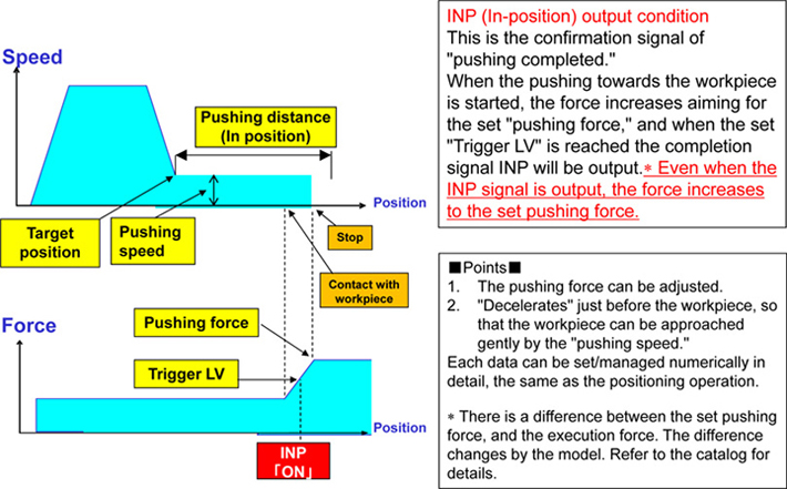 Thrust operation involves moving from 'the target position' with 'thrust speed' through 'acceleration' ⇒ 'constant speed' ⇒ 'deceleration' and thrusting in contact with the thrust object with the target thrust force.