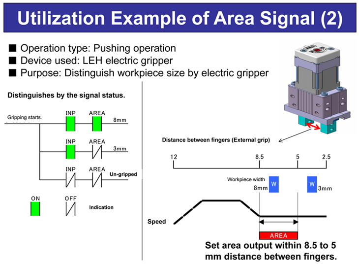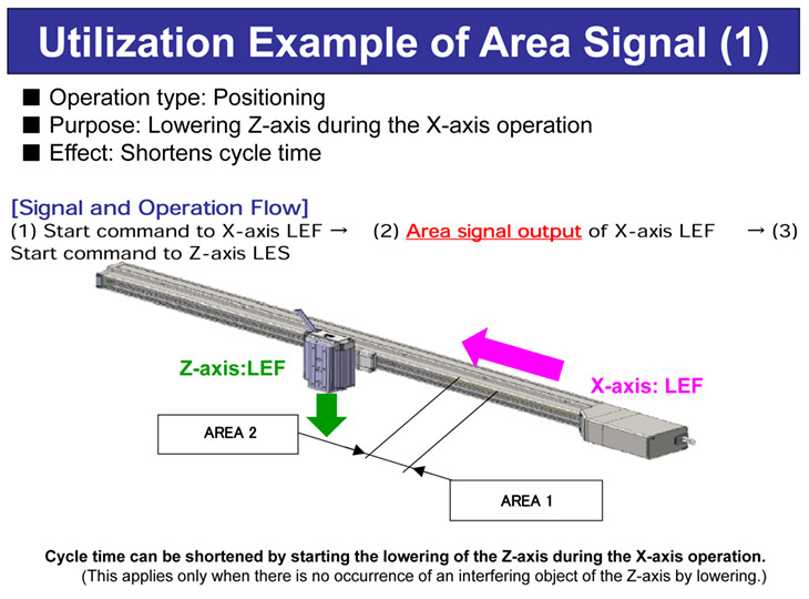 An AREA output signal is generated when an actuator passes between the pre-defined AREA 1 and Area 2 specied in the step data of the controller.Refer to the example shown below.