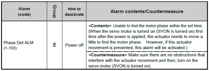 Perform an adjustment of the magnetic pole position during the "1st SVON after the power supply of the LECP6 is turned ON." The motor must be moved to find the position. When the movement is obstructed, or the power supply required for the movement is insufficient (shutdown), an alarm will occur because the magnetic pole cannot be found. After the magnetic pole is set, the magnetic pole detection will not be performed during SVON, unless the power supply of the LECP6 is turned OFF.