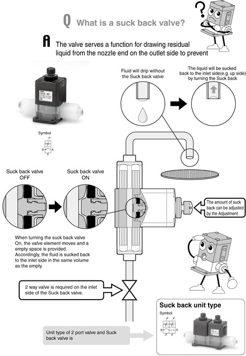 The valve is designed to draw back any residual liquid at the nozzle end of the outlet side to prevent dripping. The single type of the suck back valve has only the function of a volume change in opening and closing the diaphragm and can not stop the flow of fluids.