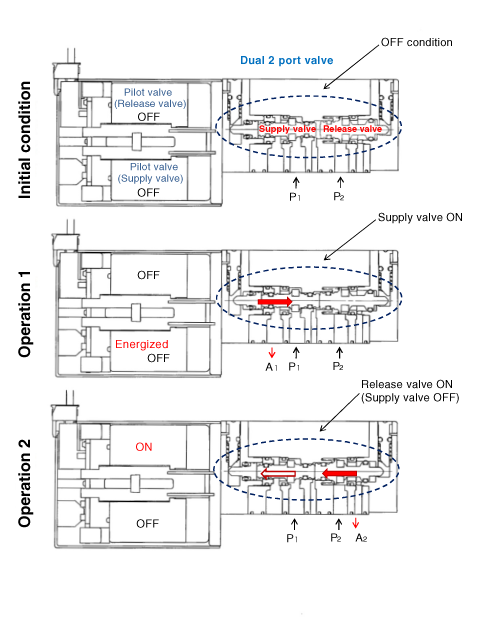 These valves are pilot valves. They constitute “dual 2-port valves” which open and close the two built-in main valves (2-port valve x 2, each of which is called a supply valve and a release valve, respectively).