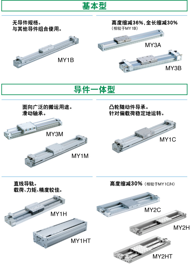 型号有MY1□/MY2□/MY3□系列。有关各自的特点请参考下记内容。另外「-Z」的更新品也在依次扩展中。Guide Cylinder Selection Software