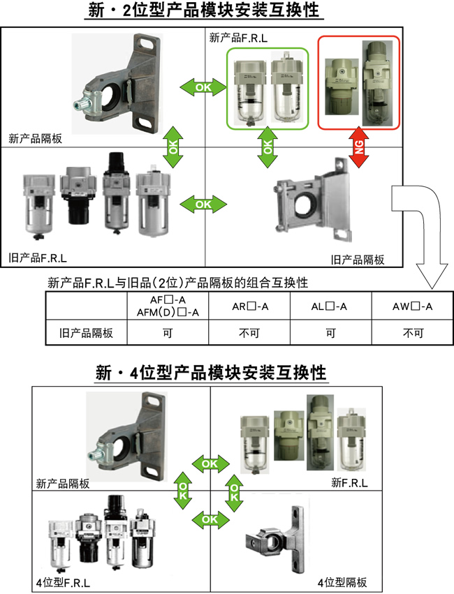 收敛品(白色本体)F.R.L组件,与AC2位产品及旧品AC4位产品的互换性,请参考下图。
