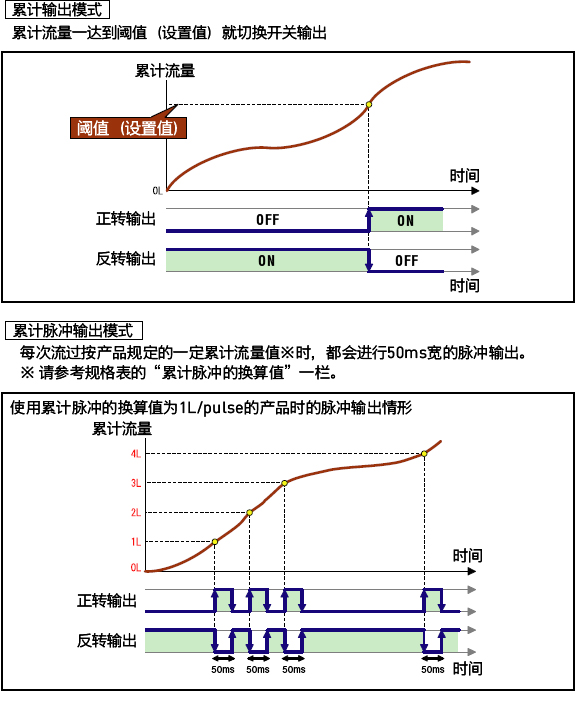 【累计输出模式】…在确认某个期间的总流量时使用,累计流量一达到阈值(设置值)就切换开关输出的模式。 【累计脉冲输出模式】…在远程监控流量时使用,每次流过一定流量都会进行50ms宽的脉冲输出的模式。通过计算脉冲输出数,可以测量累计流量。