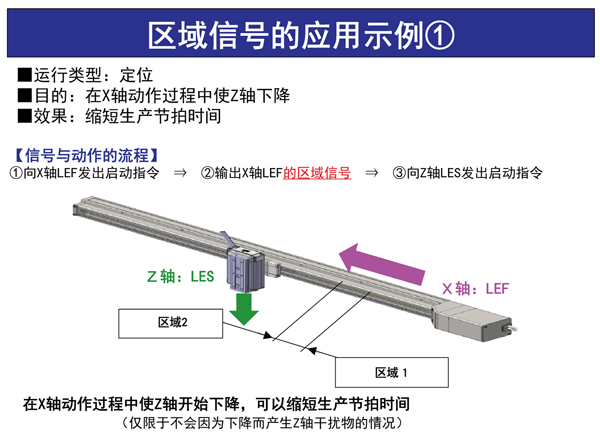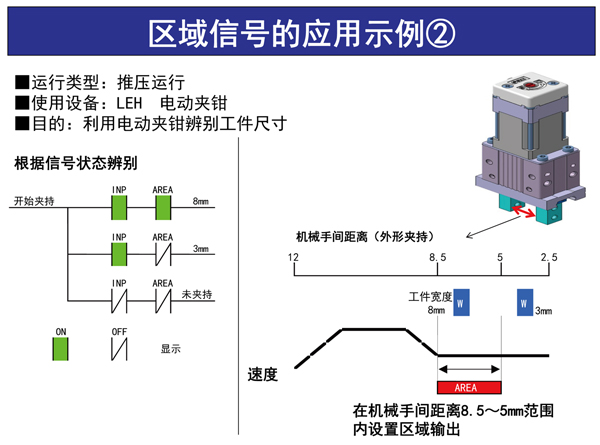 执行器移动时,只要通过事先输入的区域1与区域2之间,即可输出区域(AREA)信号。定位运行和推压运行均可设置。请参阅下列应用示例。