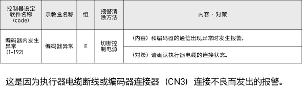 控制器的〔ALM〕点亮后,通过计算机(or示教盒)确认了报警内容。编码器上显示发生异常1-192(or编码器异常),此内容是什么意思?