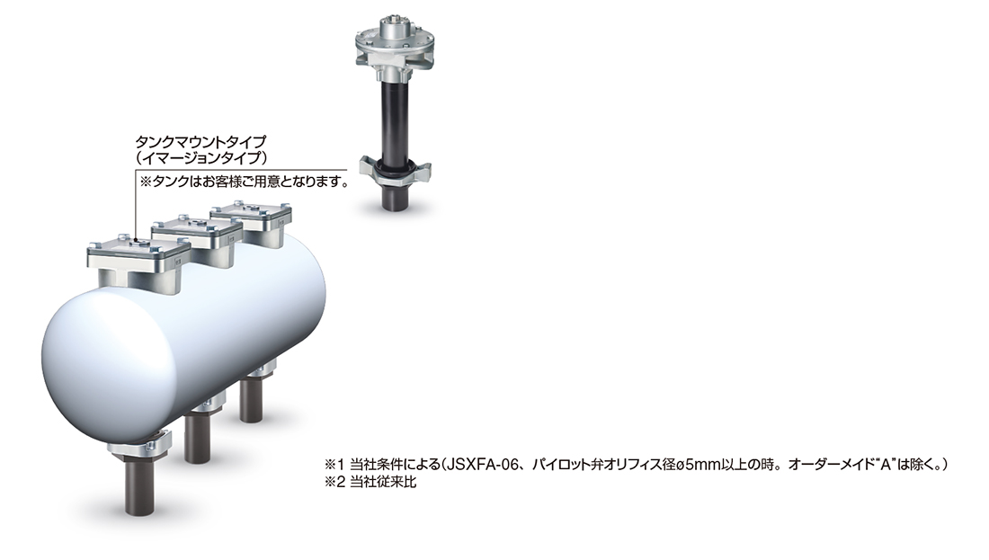 JSXFA エアオペレート | N.C. | 3/4(20A) 1(25A) 1 1/2(40A) 2(50A) | コンプレッション フィッティングタイプ 直管タイプ (Rc, NPT, G) タンクマウントタイプ (イマージョンタイプ) | 32, 40, 45, 50, 55 (φ55はタンクマウントタイプのみ) |