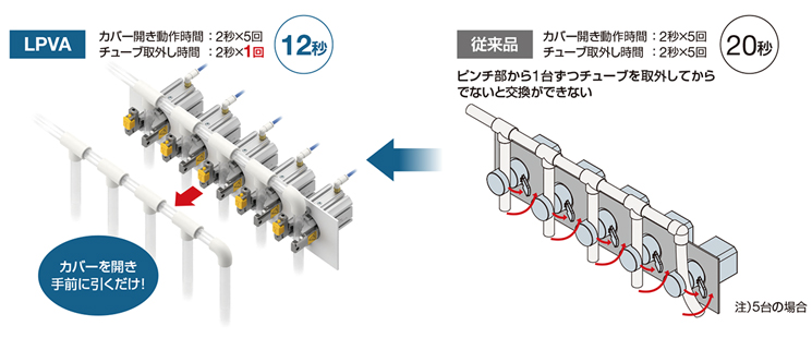 まとめてのチューブ取外しが可能なため、1台ずつ交換をする必要がありません。