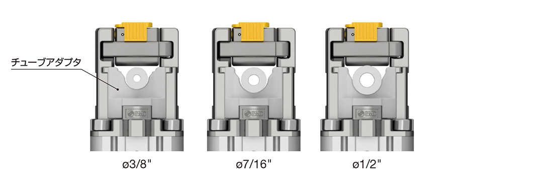 チューブアダプタを交換することで3サイズのチューブに対応可能。