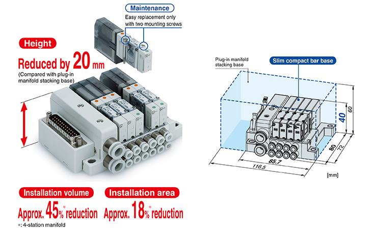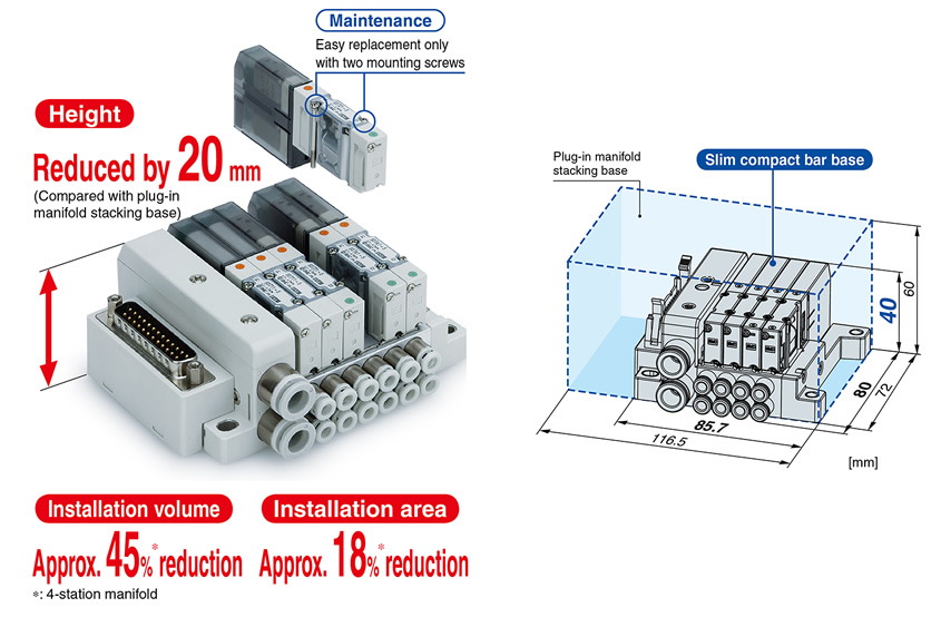 ・细长紧凑的集装阀岛:设置空间减少45%※