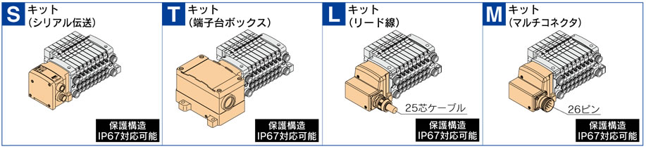オートスイッチ/圧力スイッチ/フロースイッチなどの入力 機器を接続するユニットや、電磁弁/リレー/表示灯などの 出力機器を接続するユニットが、順不同で連結可能です。 注)SIユニットを除く